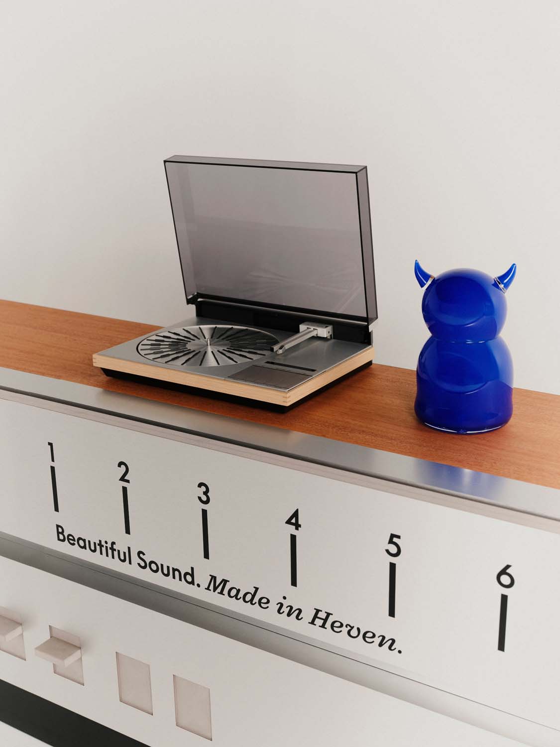 V bližini gramofon Beogram 4000c stoji na svetleči, kiparski polici studia Home and Heven. Ob izbrani vinilni plošči ponuja sodobno interpretacijo dediščine Bang & Olufsen, hkrati pa ohranja akustično vzdušje kavarne.