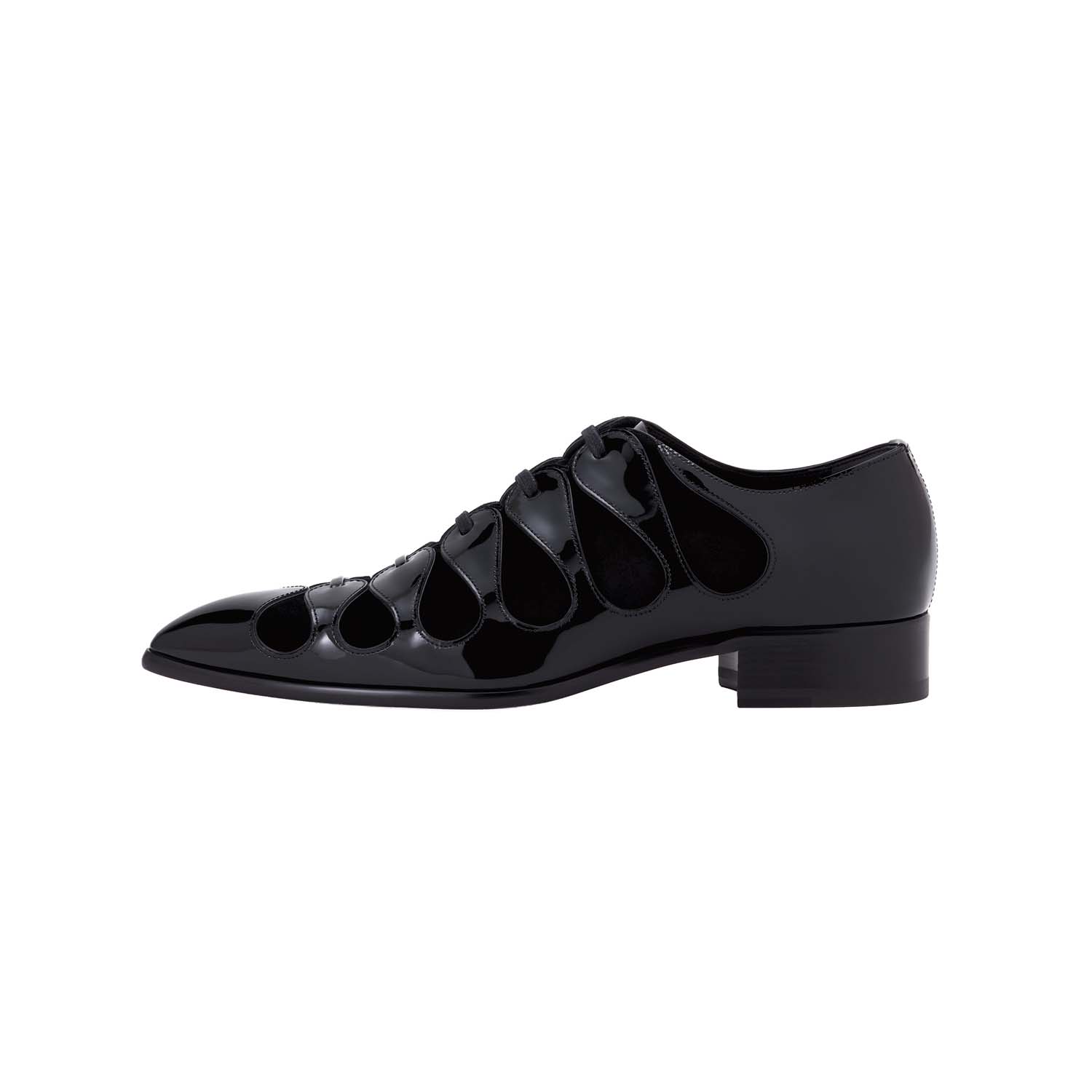Sveža prenova arhivskih čevljev z vezalkami Circus predstavlja presenetljiv lasersko rezan dizajn, zasnovan kot dialog med lakiranim in semišastim črnim telečjim usnjem v igrivi fuziji navdihov. Estetika cirkuških šotorov in nabranega harlekinovega ovratnika je teatralno interpretirana v teh kontrastnih, a enobarvnih materialih.