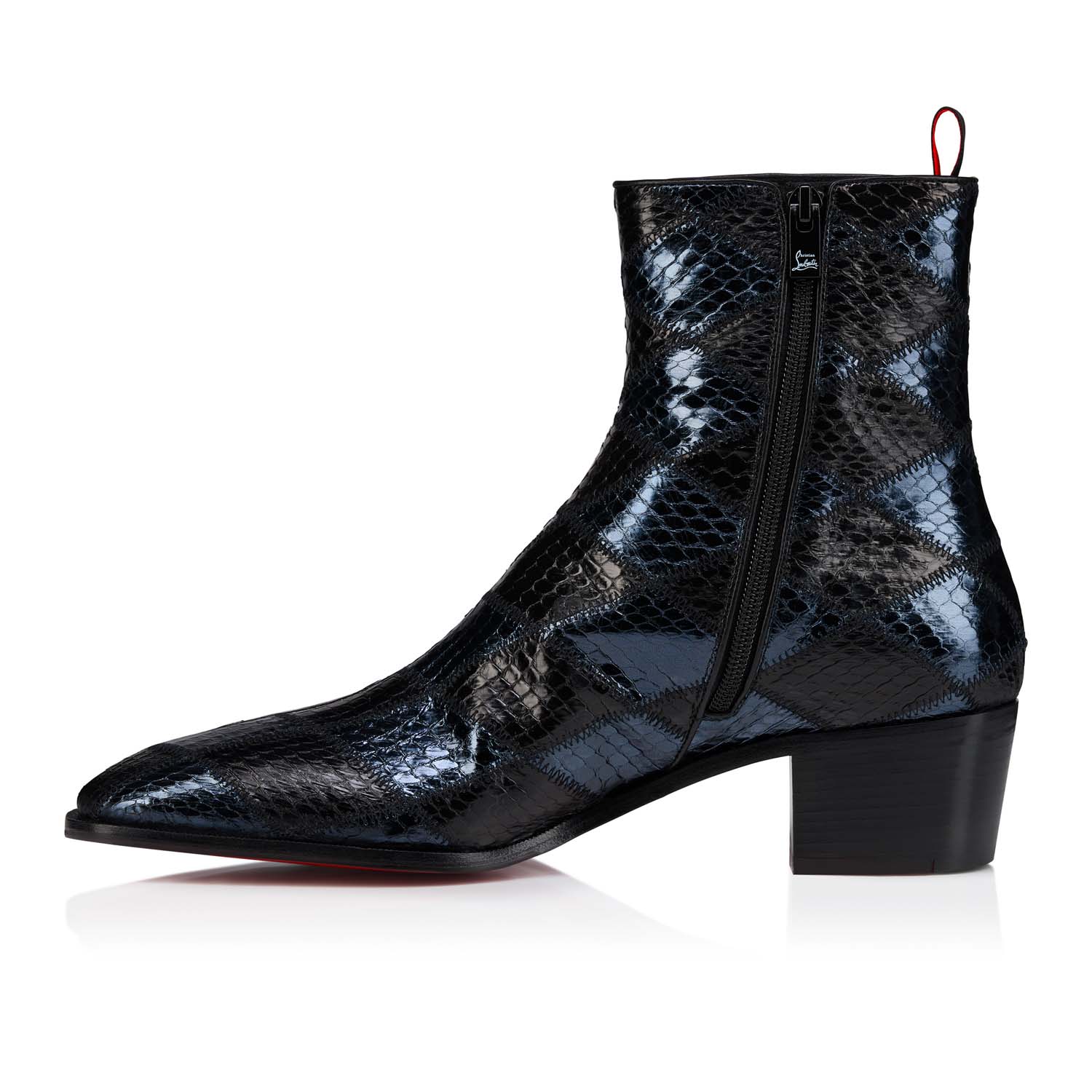 Gležnarji Zigissimo Forever predstavljajo kontrastne tone v presenetljivi kompoziciji geometrijskih kosov odgovorno pridobljenih kož vodnih kač v obliki diamanta, ročno izrezanih, ročno spojenih in sešitih s cikcak šivi, kar je fizično utelešenje dediščine mojstrstva Maison Christian Louboutin.