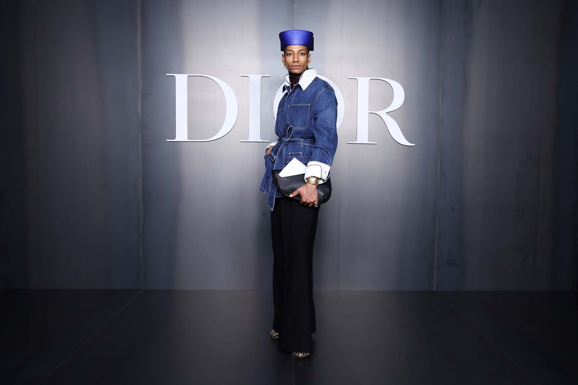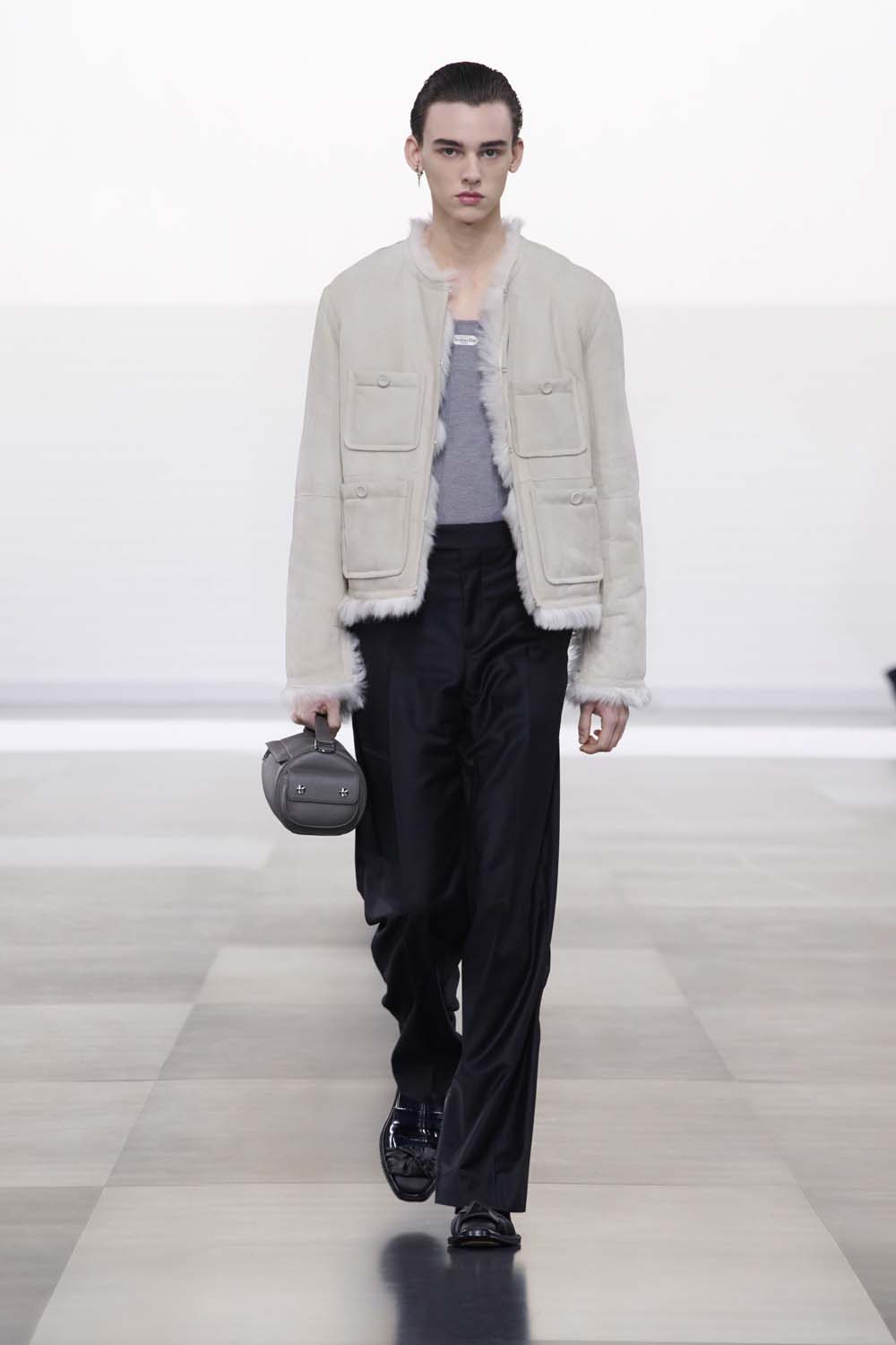 Usnjeni izdelki Dior obdajajo občutek dvojnosti, z mehko izdelanimi, prožnimi oblikami, ki jih kontrastirajo namenska ločila bolj moške opreme. Mehke, oprijemljive Diorjeve valjčaste oblike iz ovčje kože so v kontrastu z Diorjevimi Normandy torbami iz izjemnega usnja. Medtem ko se ideje o moškem znanju pripovedujejo z bolj tradicionalno žensko izdelavo čevljev, kjer so klasični moški usnjeni čevlji in Dior Palmarès visoko polirani usnjeni škornji. Z vezano satenasto kapo – ali »kapo z motivom«, ker se nadvaja na ponavljajoči se motiv modre moške kože skozi celotno kolekcijo. Ročno vezeni hibridni čevlji po posebnem naročilu z arhivskim vezenim čevljem iz leta 1961 združujejo ekstravagantnost z odlično ročno izdelavo.