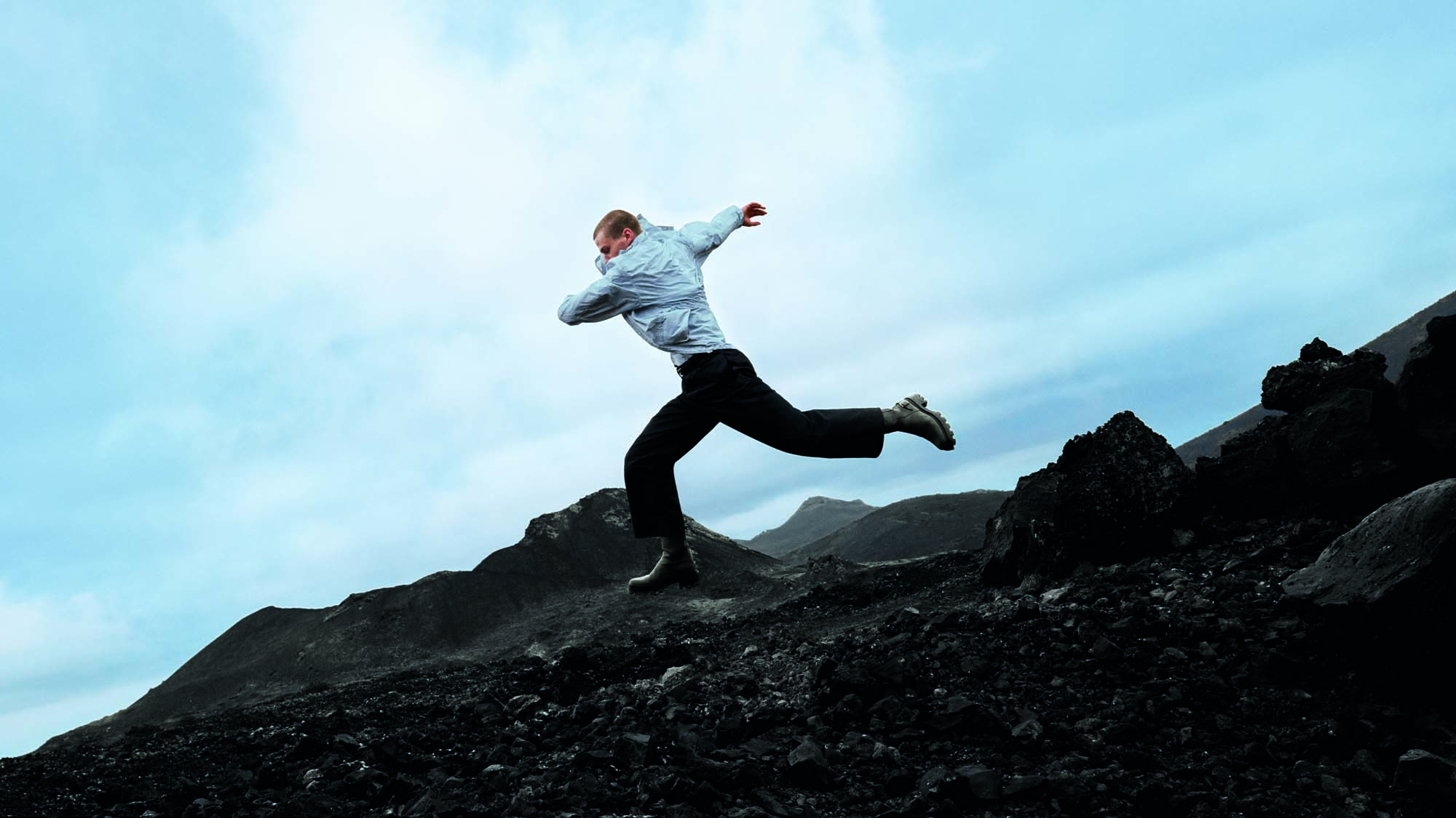 Model hodi po temnem skalnatem terenu pod svetlim nebom v kampanji Hermès H08, ki simbolizira odnos med časom, gibanjem in naravo.