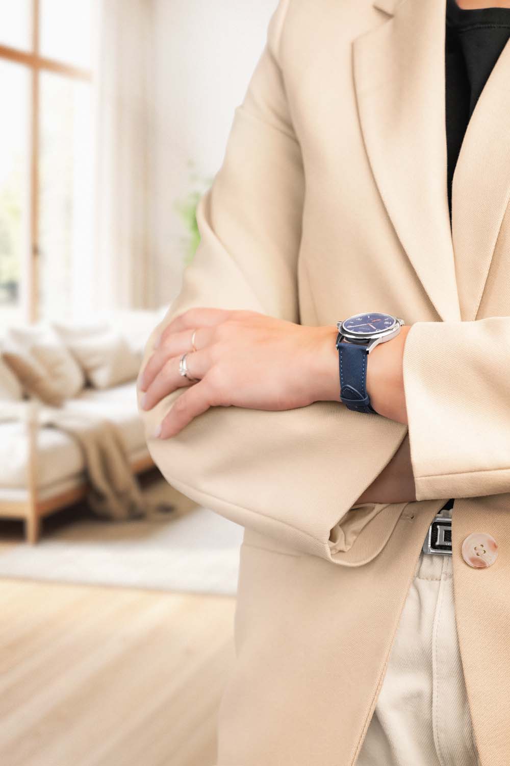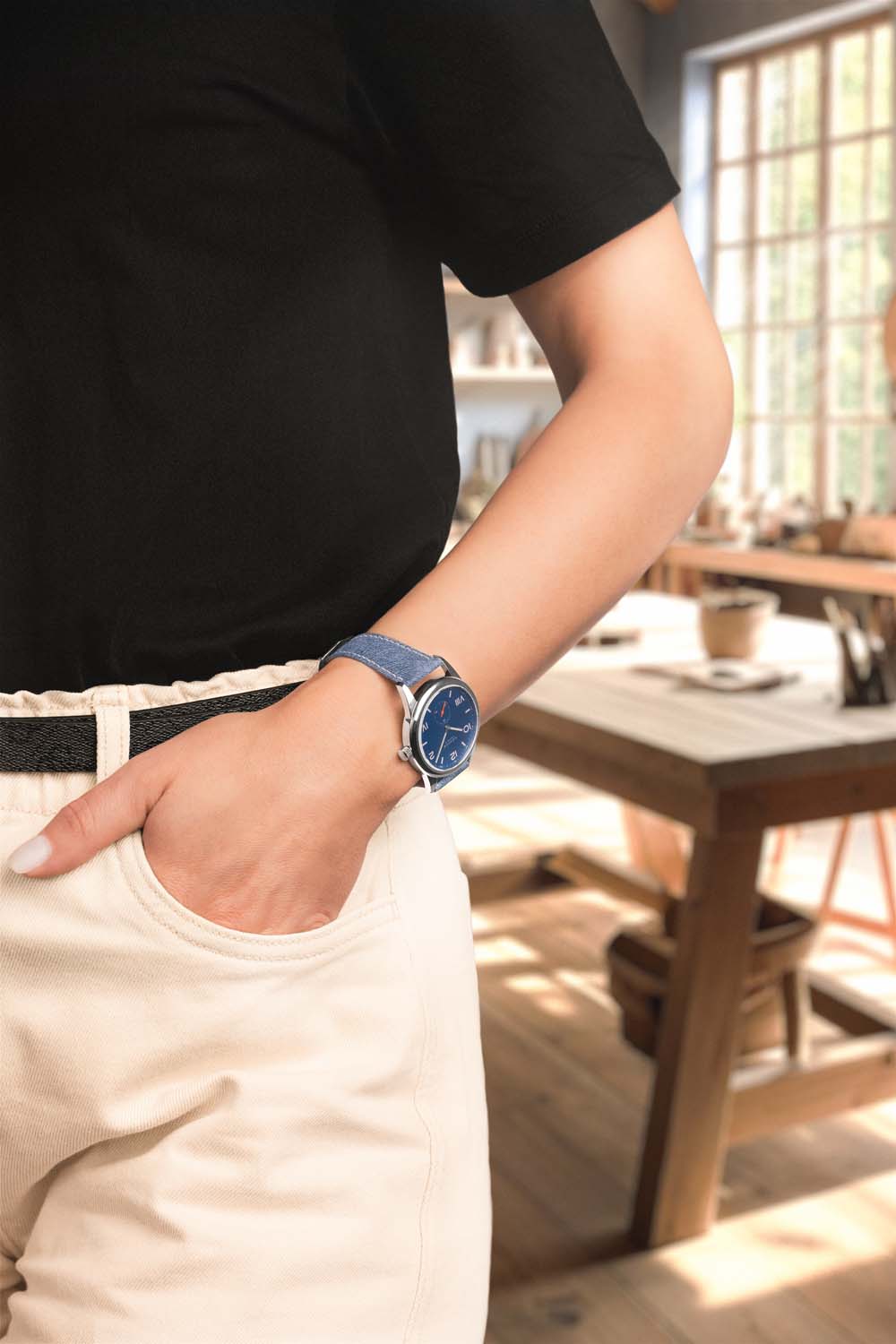 NIKOLAUS HIRSCH: Odvisno, kako se nosi. Mislim, da je to eden najpomembnejših vidikov paščka, kako se oseba z njim počuti na zapestju. Če je torej zelo tog, ura ne sedi pravilno. In potem imate lahko uro za sto tisoč evrov ali za 10.000 evrov ali katero koli drugo uro. Če se ne počuti prav, se pač ne čuti pravilno. In to velja. Za pritrditev ure na zapestje potrebujete kakovosten pašček, sicer je ne morete pritrditi na zapestje. Zato mislim, da je to eden najpomembnejših delov. Drug vidik pa je barva in material. Torej, odvisno od barve ali vrste materiala lahko uro preprosto poenostavite ali polepšate. Športnejšo uro lahko naredite bolj elegantno, če jo kombinirate s paščkom iz krokodilske kože. Elegantno uro lahko naredite bolj sproščeno, na primer s paščkom iz telečjega usnja, ki sem ga pravkar omenil. Torej je to vidik, ki ga boste spet poznali pri vseh drugih blagovnih znamkah, ki ste jih obiskali, ali iz različnih panog, ki ste jih obiskali. Barva je za nas kot ljudi zelo, zelo pomembna. Kako se oblačimo, je izraz in to lahko izrazimo z barvo, kakor se počutimo. Na primer, ure imajo večinoma črno, sivo, belo ali srebrno številčnico. Torej lahko z barvnim paščkom izrazite, kaj čutite, in ura bo ta občutek zagotovo prevzela.