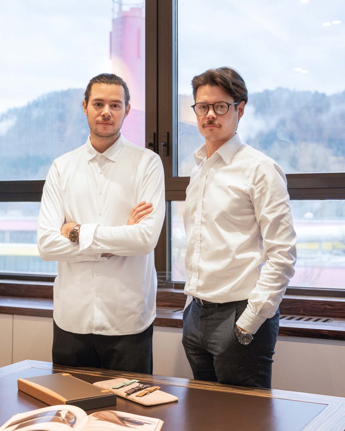 NIKOLAUS HIRSCH: In bilo mi je všeč. Potem pa sem šel v Švico delat v hotel. In to je bila izkušnja, ki mi je odprla oči, ker po tem nisem hotel delati v hotelu, zato sem vedno želel početi svoje stvari. Torej, dva paketa, ki ju imate tukaj, sta darili za vas. Eden mojih prvih podvigov skupaj z bratom leta 2013 je bila ustanovitev podjetja za izdelavo nakita, zapestnic za moške, in to iz usnja, ki ga imamo in bi ga lahko ponovno uporabili. In to je bila nekoliko uspešna, a predvsem učna izkušnja. In na neki točki me je oče oziroma mene in mojega brata povabil, da se pridruživa strateškemu projektu, na katerem smo delali. In zanimal me je ves svet, da bi ga globlje spoznal. In iz tega, ja, iz tega se je veliko stvari postavilo na svoje mesto. Tako sem začel svoj blog o urah. In bil sem globoko potopljen v svet ur. Obožujem ure. In potem je moja ljubezen do ur sprožila mojo strast do paščkov za ure. In veliko teh izdelkov, ki jih vidite tukaj, je ustvarila moja ekipa, ker sem začel v oddelku za trženje in nato v razvoju izdelkov, nato pa sem bil del vodstva in ja, danes lahko vodim podjetje z bratom.