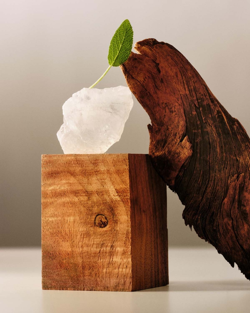 Igra materialov zrcali dišavo v notranjosti – kompozicijo kontrastov, ki ujame dvojnost sodobne moškosti. Ta dialog nasprotij se nadaljuje tudi v zunanji embalaži, kjer subtilno teksturirana siva škatla uokvirja prefinjen panel z lesnim vzorcem.
