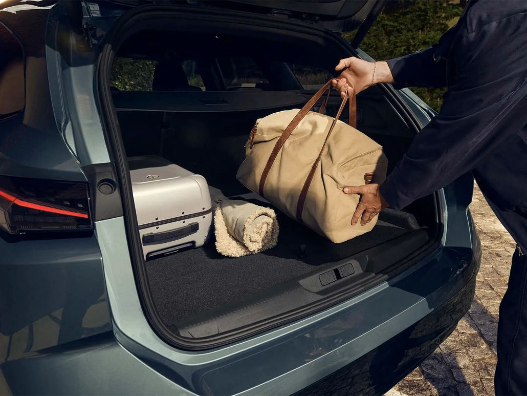 Oseba nalaga potovalno torbo v prostoren prtljažnik novega Peugeota 308 SW, v katerem sta tudi kovček in odeja.