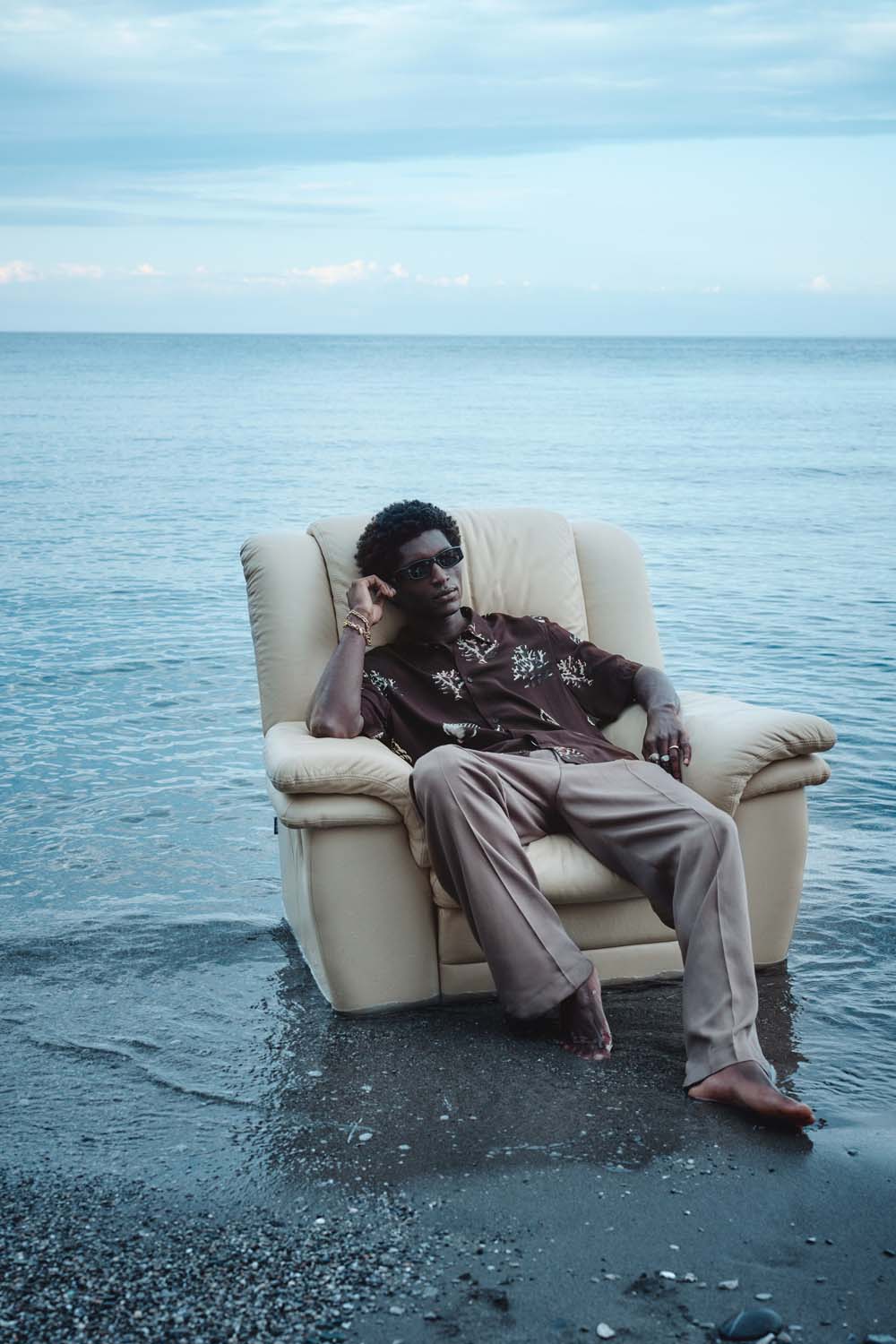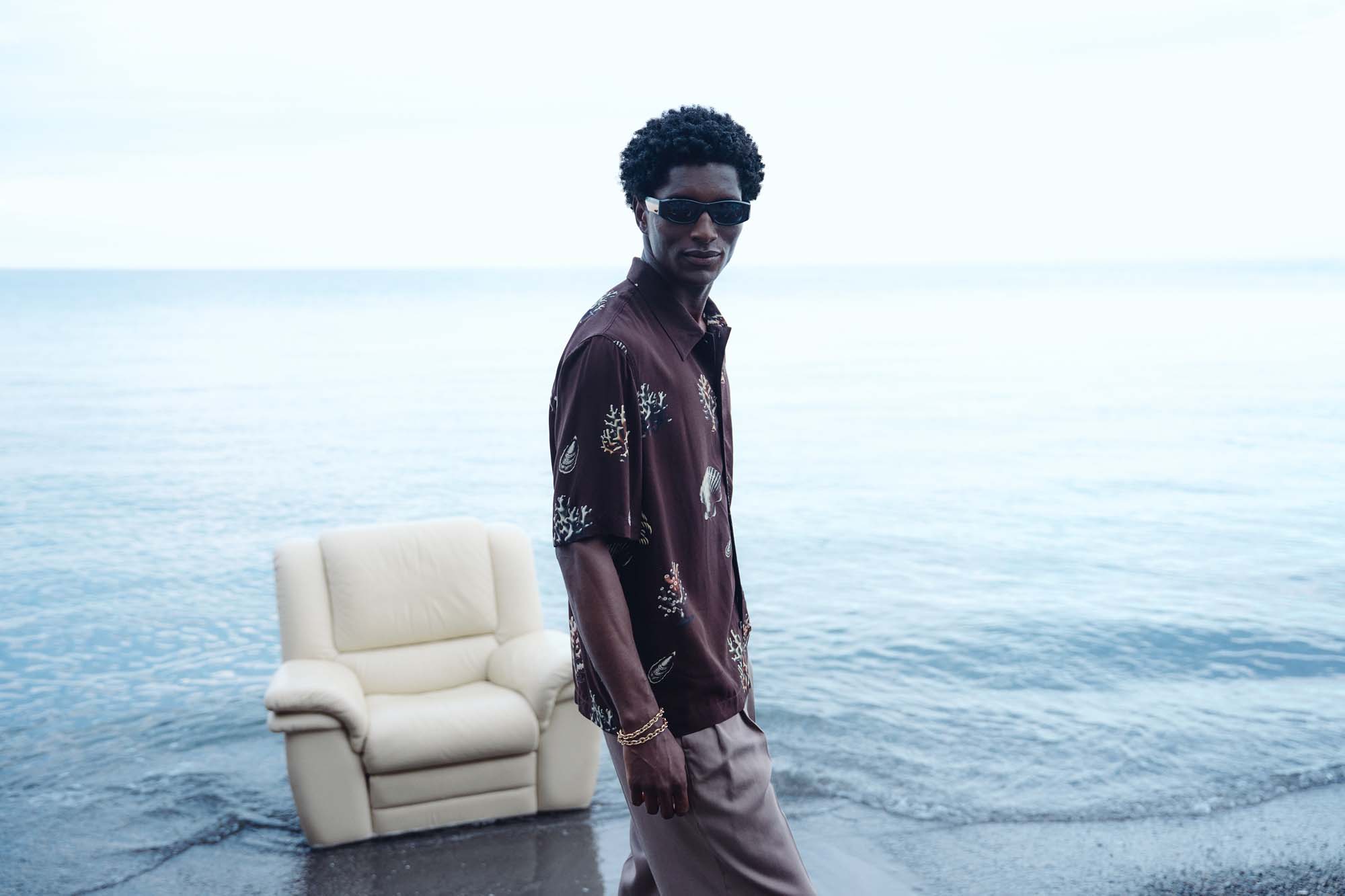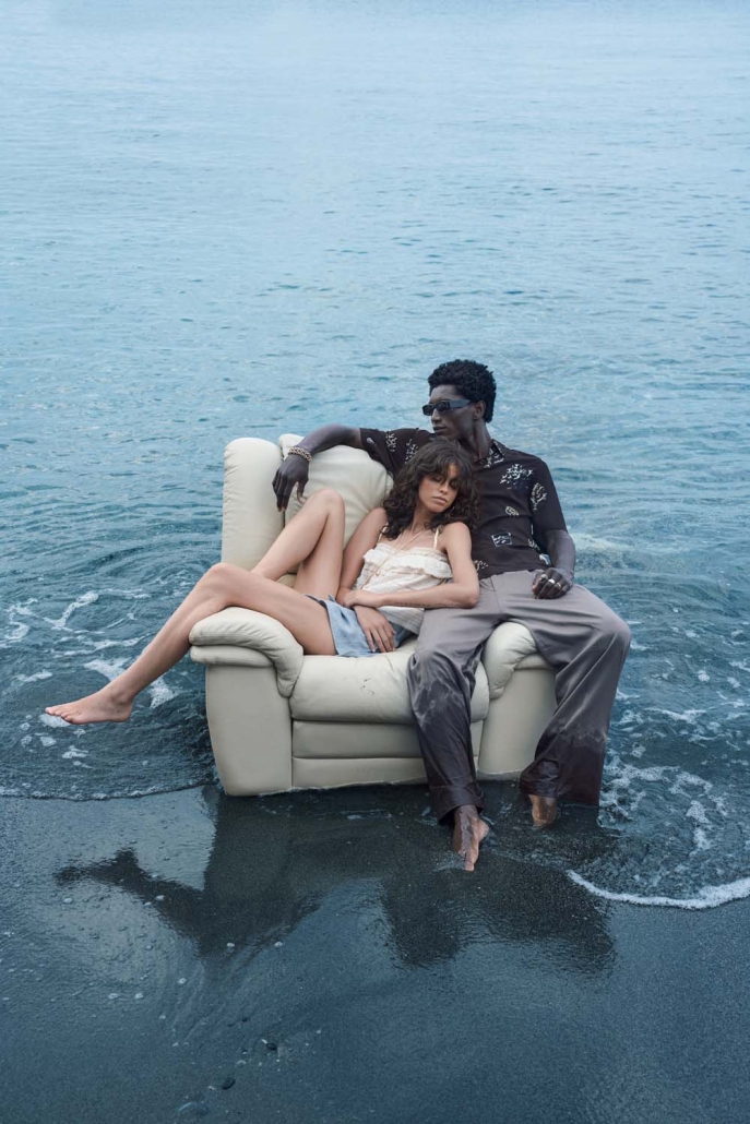 Lahke naravne tkanine se srečajo z morskimi teksturami, vzorci in žakardi, ki spominjajo na korale, školjke in ladijske vrvi. Robustne delovne hlače so kombinirane s lanenim krojenjem, kar ustvarja dialog med funkcionalnostjo in obliko.